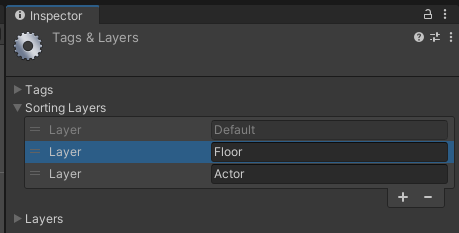 那么现在需要点击下拉列表,然后点击 Add Sorting Layer 添加新的图层。然后界面跳转之后,点击 + 号添加新图层,然后新图层名字命名为 Floor。创建完毕之后,确保你的 Floor 层在 Actor 层之上。拖曳图层的 = 按钮,就可以调整它们的排序。