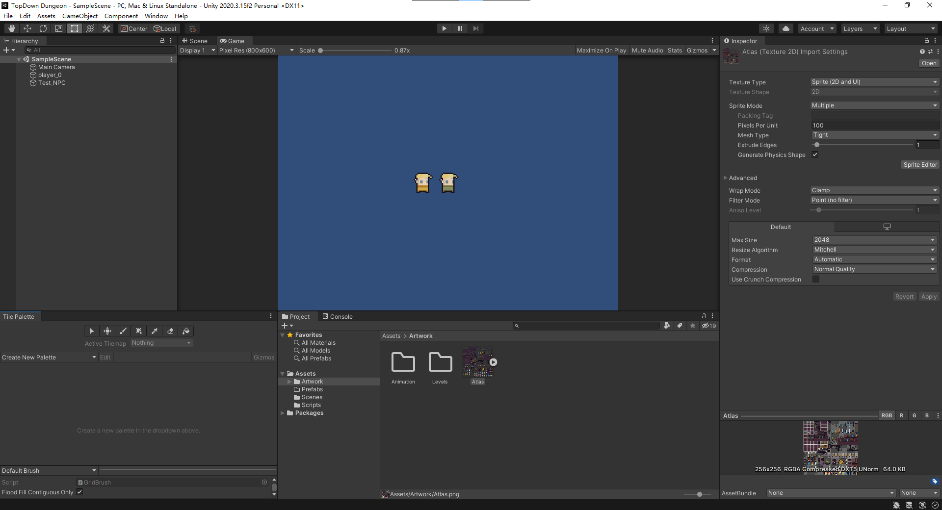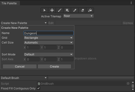 在 Tilemap Palette 面板中,点击 Create New Palette 创建新的(图块)调色盘,我们将其命名为 Dungeon。