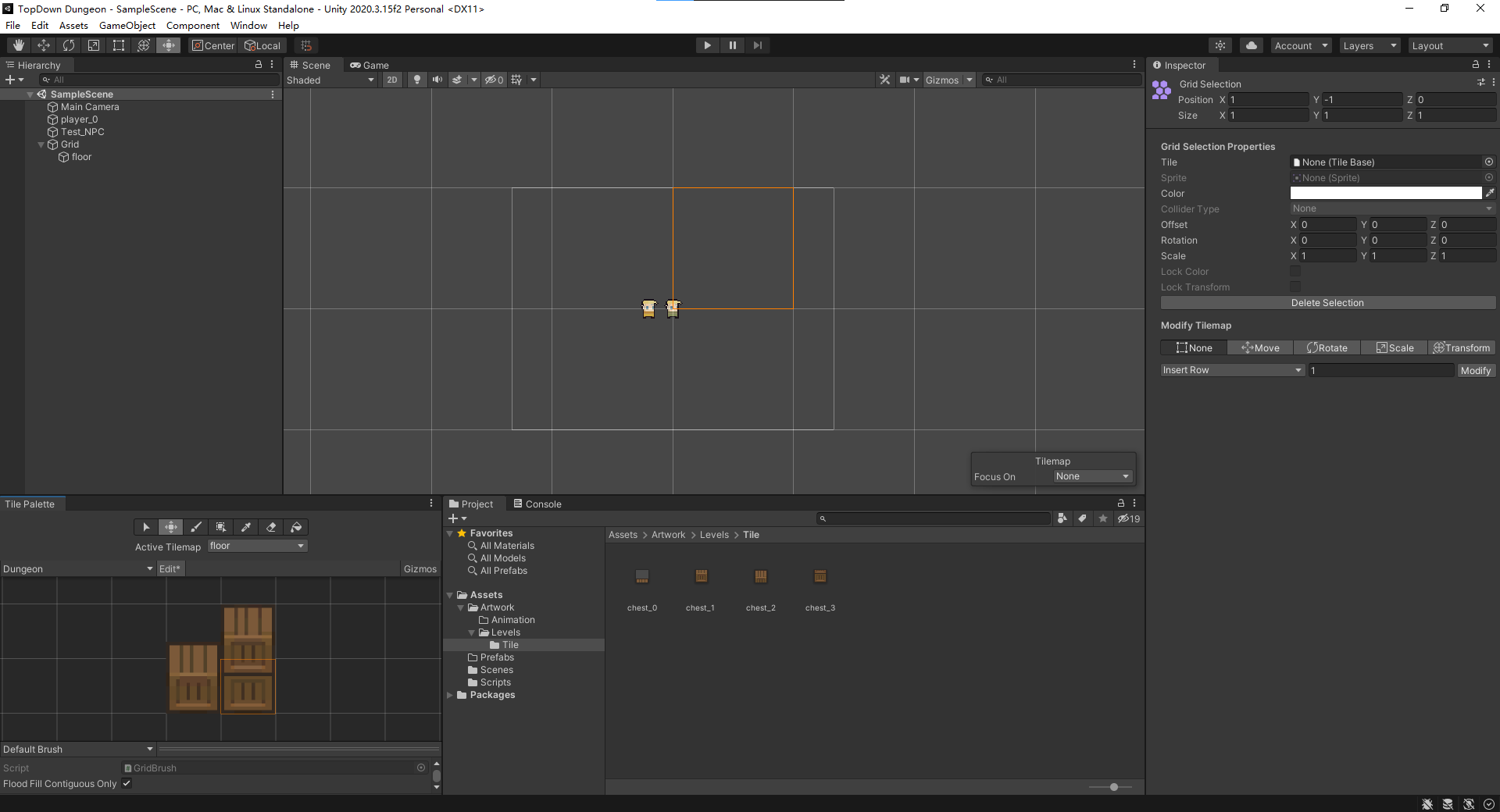 我们回到 Project 面板,找到我们需要加为图块的图片。按住 CTRL 多选,我们先选择四个箱子,然后拖曳到 Tilemap Palette 面板中,这里就由原先的灰色背景转为一个网格状的样子。