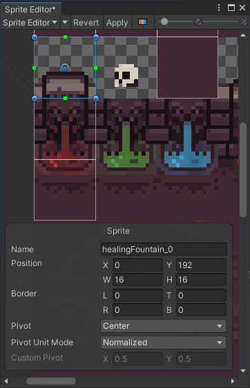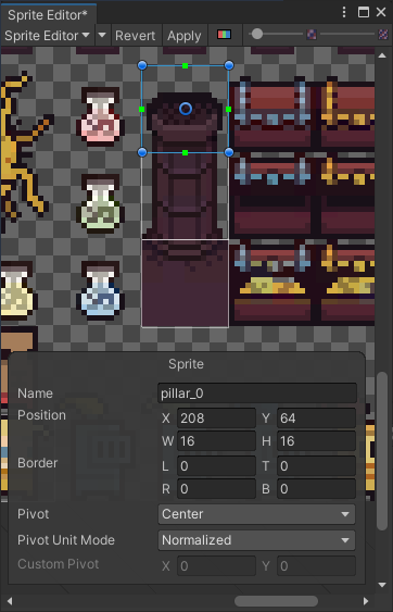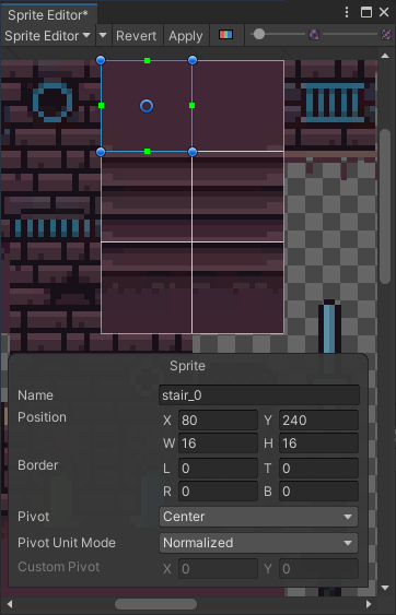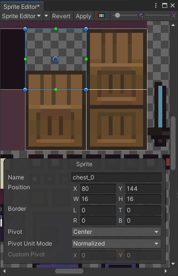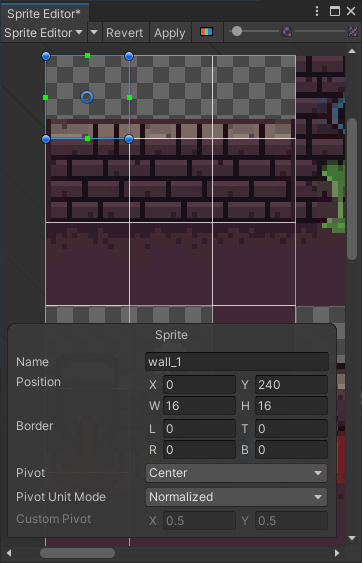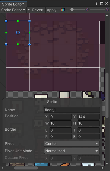 接下来,我们要使用 Unity 的 Tilemap 来绘制地图。在这之前,我们需要更多的地图图块,所以回到 Project 面板,找到我们的 Atlas 图集,点击 Sprite Editor 进行切片。先前我们已经切了 wall_0 和 floor_0,我们知道这个图集里所有的图块都是 16 × 16 的单位。就算它比较高,那么也是 32 × 16,都是 16 的倍数。