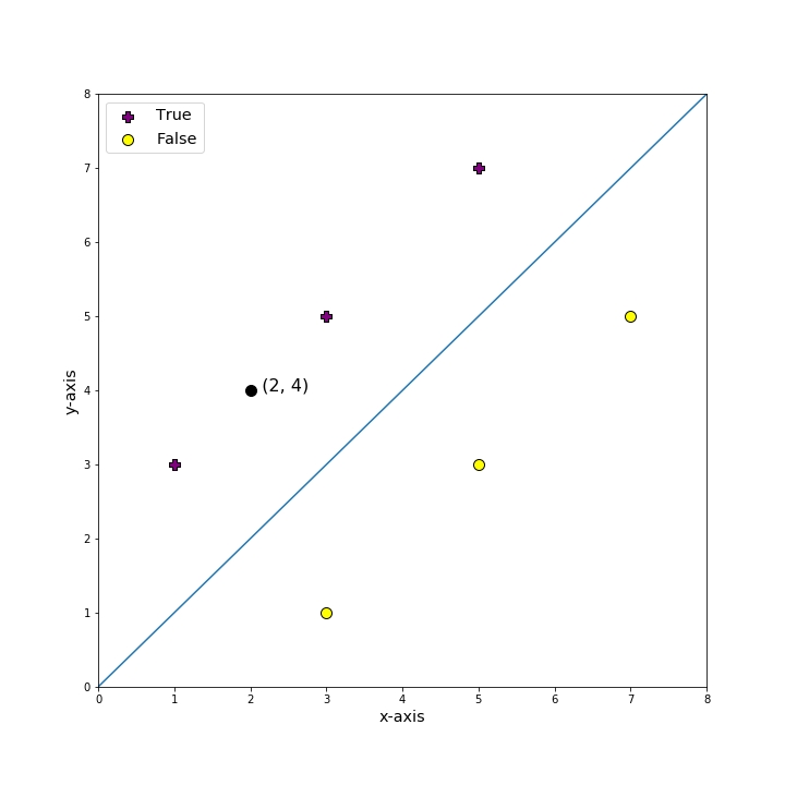 我们可以看到上图中绘制的点和分隔数据的线。点(2, 4)在图上标出,你可以看到它在线的正侧,因此结果是1。