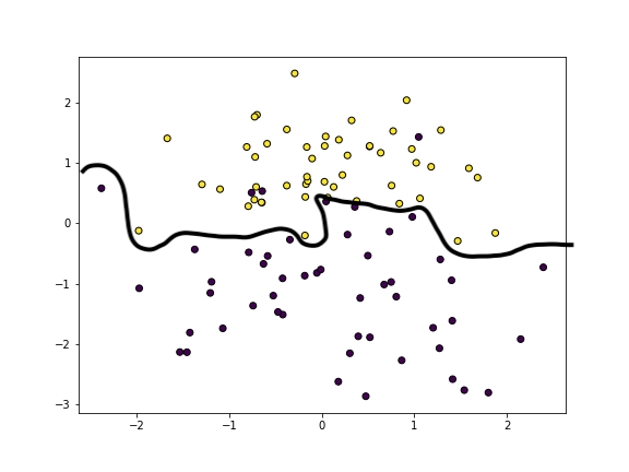 我们可以从视觉上看出一个过拟合的模型如下。这条线试图过于贴近每个数据点的正确一侧,但却忽略了数据的本质。