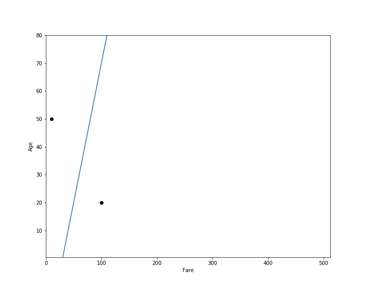 如果我们有一个乘客的数据,我们可以使用这个方程来确定他们在直线的哪一侧。例如,假设我们有一个票价为 100,年龄为 20 的乘客。
