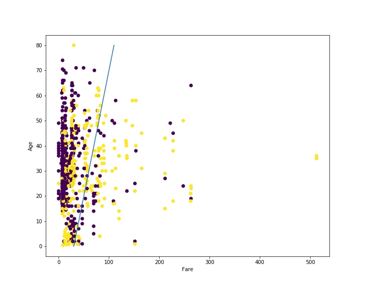 下面是一个好的示例。该线用于对新乘客进行预测。如果乘客的数据点位于线的右侧,我们会预测他们会幸存。如果在左侧,我们会预测他们未幸存。
