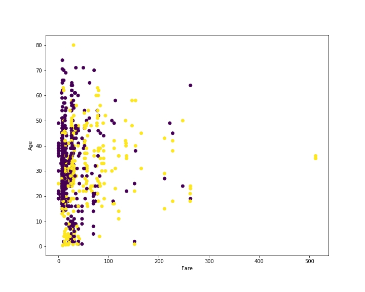 我们将乘客票价(Fare)绘制在 X 轴上,然后将其年龄绘制在 Y 轴上。黄色点是幸存乘客,紫色电视未幸存乘客。这个图的代码如下:
